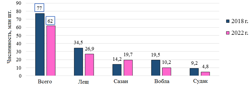 На рис. 1 представлены изменения численности молоди полупроходных видов рыб, произошедшие в период исследований с 2018 по 2022 г., наибольшее сокращение, почти в 2 раза, отмечается у воблы и судака, у леща – в 1,2 раза, а количество сазана увеличилось в 1,4 раза.