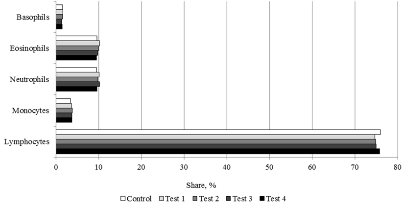 A fairly informative indicator in assessing the overall physiological state of the body is the leukocyte blood formula, which reflects not only the physiological state of fish, but also some aspects of cellular immunity. Changes in the leukogram can detect metabolic disorders and deterioration of the condition of the studied object long before the appearance of clinical signs of emerging pathologies [23]. The leukocyte formula of the blood of the fish under study is presented in accordance with Fig. 4.