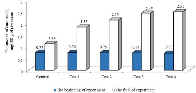 The most carotenoid in the liver was observed in Tests 3 and 4, the indicators in these study groups were higher by 1.31-1.37 mg per 100 g of raw tissue, in contrast to the control sample.