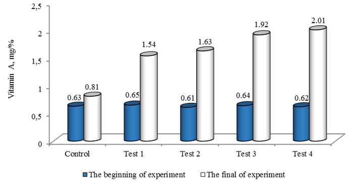 Upon completion of feeding, the fish that consumed feed, with the addition of astaxanthin, the indicators for the amount of vitamin A accumulation changed significantly compared to the control group. The indicators of Tests 1, 2, 3 and 4 were 1.9, 2.0, 2.4 and 2.5 times higher, respectively, in comparison with the control sample.