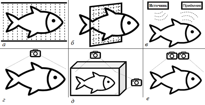 based on scanners and frames (а, б), sonar (в), video cameras (г, д, е)