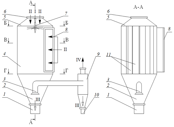 8 – inlet pipe of the drying agent; 9 – cyclone; 10 – collection of dry product;