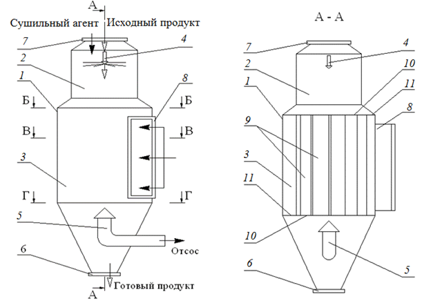 1 – сушильная камера; 2, 4 – патрубок для ввода сушильного агента; 3 – распылитель;