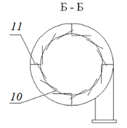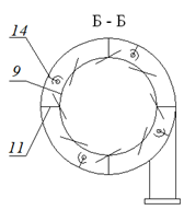 Последовательность функционирования аппарата: изначально высушиваемый материал поступает сквозь распылительное устройство 3 в зону обезвоживания камеры 1. Теплоноситель поступает по штуцеру 2. Дисперсные частицы под влиянием теплоносителя и радиационного подвода энергии обезвоживаются и далее отводятся посредством системы откачки 4 и отделяются от отработанного теплоносителя в циклоне 8; высушенный материал снизу циклона поступает в приемный резервуар 7 сквозь патрубок 9, подача высушенного материала снизу выгрузочного отсека 5 в резервуар 7 осуществляется сквозь патрубок 6. В полости сушильной камеры 1 имеются галогенные излучатели 10, установленные в патроны 11, которые размещены и жестко зафиксированы с равным шагом круговым массивом на кольцевой панели 12, соединенной с внутренней поверхностью сушильной камеры в верхней ее части стержневыми крепежными элементами 13. Угол c между патронами равен 360 / n, где n – количество патронов, которое зависит от диаметра сушильной камеры и расходных характеристик сушилки. Патроны 11 для галогенных излучателей размещены на кольцевой панели 12, закрепленной на внутренней стенке цилиндрического корпуса сушильной камеры 1 (см. рис. 5, а). Галогенные излучатели 10 выполняют функцию подвода лучистой энергии к объекту сушки, при возможности объемного энергоподвода к нему, ввиду пропускательной способности излучения и возможности обеспечить большую плотность теплового потока при его регулировании вследствие малой инерционности излучателей при смене режима подвода тепла.