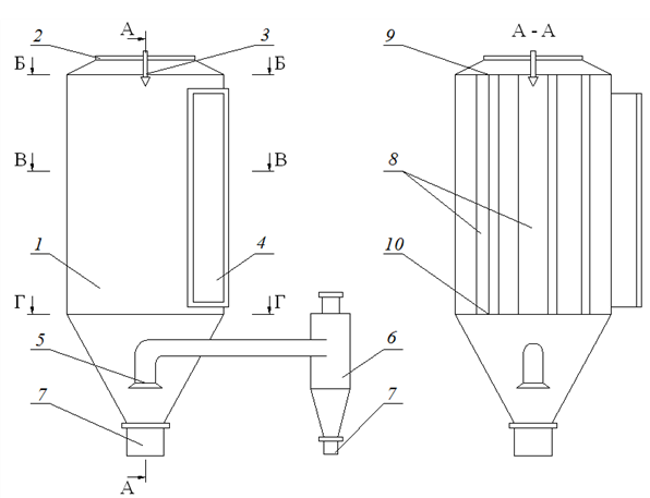 8 – патрубок ввода сушильного агента; 9 – циклон; 10 – сборник сухого продукта;
