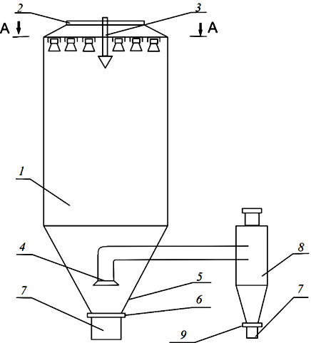 5 – unloading compartment; 6, 9 – nozzles; 7 – receiving tank; 8 – cyclone;