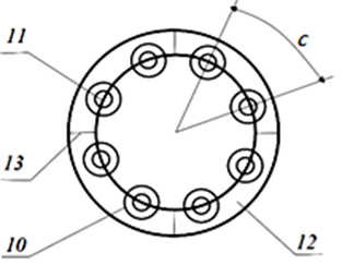 11 – патроны; 12 – кольцевая панель; 13 – стержневые крепежные элементы; c – угол между патронами