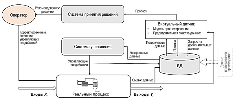 Значения параметров реального процесса с различных датчиков аккумулируются в базе данных. Из базы данных контрольные данные поступают в систему управления, вырабатывающую управляющие воздействия на исполнительные механизмы управления реальным процессом. Виртуальный датчик взаимодействует с базой данных, получая исторические данные о ходе процесса и запрашивая дополнительные данные. На основе этой информации после предварительной очистки данных модель прогнозирования вырабатывает прогноз изменения параметров процесса и рассчитывает необходимые изменения управляющих воздействий. Прогноз направляется в систему принятия решений, где генерируется окончательное управленческое решение, которое, в свою очередь, передается оператору для реализации в процессе. Оператор ответственен за управление процессом гидроочистки дизельных фракций, взаимодействуя с управляющей подсистемой, которая также выполняет функции управления данным процессом. Результаты прогнозирования сохраняются в базе данных. В некоторых случаях в базу данных также передается информация о плановых показателях процесса.