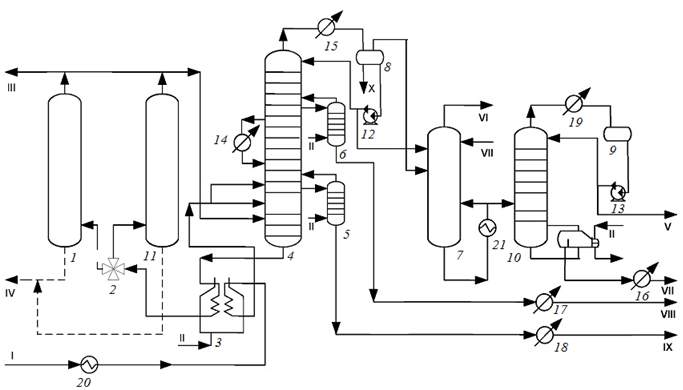 12, 13 – насосы; 15–19 – холодильники; 14, 20, 21 – теплообменники;