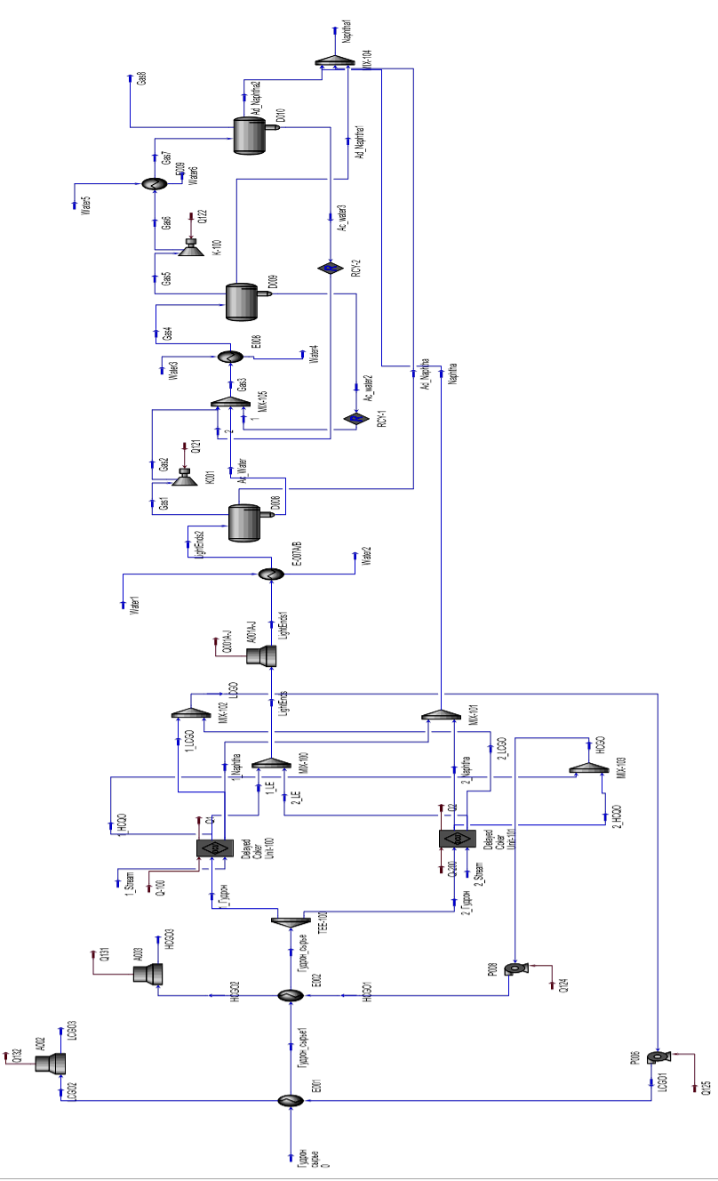 Данная схема позволяет варьировать исходные данные (расход сырья, состав сырья, его технологические параметры и т. д.) и через короткое время после расчета всей схемы наблюдать за изменениями в выходах продукта, его составе и других технологических параметрах.
