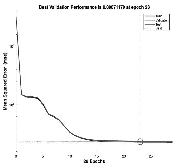 Для нейронной сети был выбран алгоритм Левенберга – Марквардта (метод оптимизации, направленный на решение задач о наименьших квадратах). Производительность модели близится к 0, что говорит о хорошей обучаемости и эффективности модели.