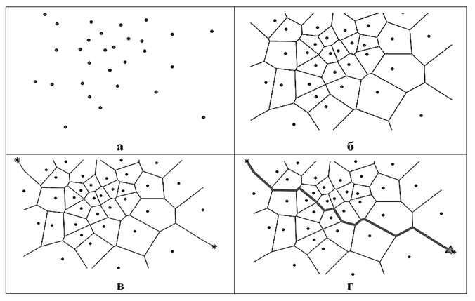 a – starting points; б – the Voronoi diagram; в – adding the starting and ending points; г – the shortest path