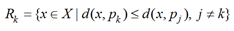 где Х – множество всех точек евклидова пространства; d – евклидово расстояние между точками x и pk, определяемое по формуле (2).