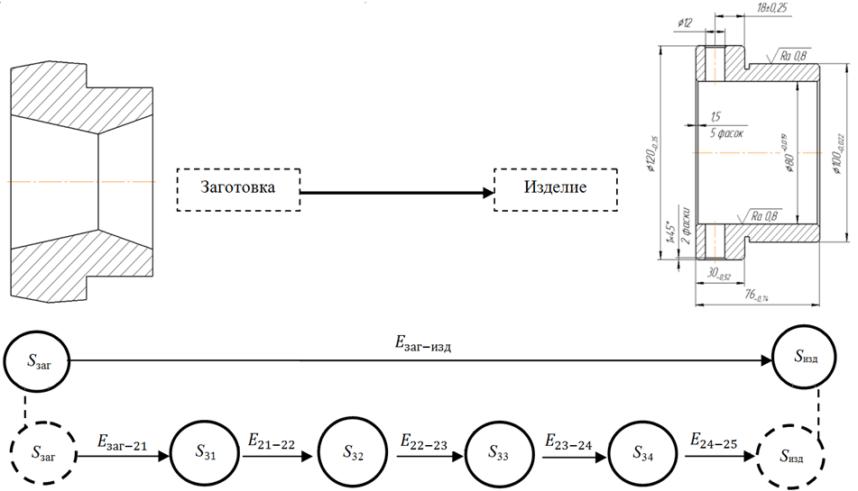 На первом уровне объект управления имеет два состояния: Sзаг – состояние изделия до начала процесса обработки, Sизд – состояние изделия после завершения выполнения всех технологических операций (рис. 1).