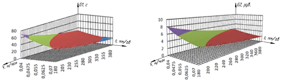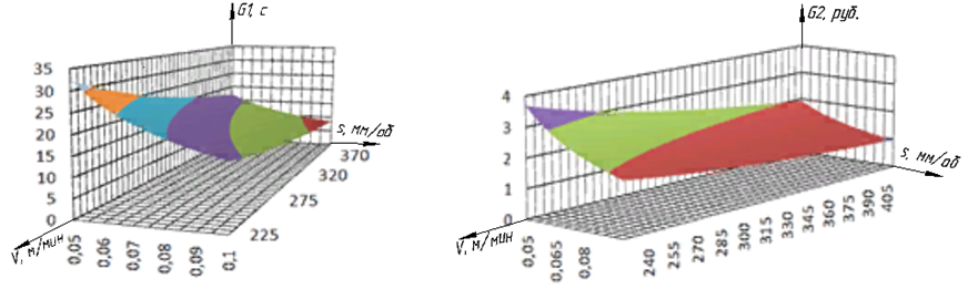 Рис. 9. Графики зависимости значений частых критериев оптимизации для промежуточного состояния объекта управления от подачи и скорости резания при глубине резания t = 1,0 мм: