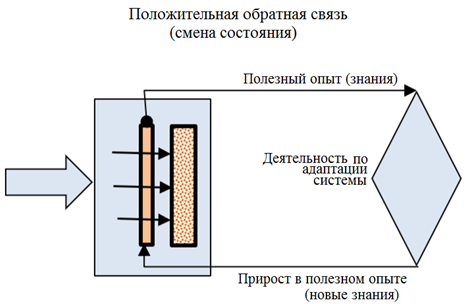 Само содержание понятия «адаптация» предполагает, что в результате адаптационного процесса должны произойти функциональные или структурные изменения в системе [11]. Способность к адаптации (к изменениям) выражается наличием не только способности поддерживать свое временно-равновесное состояние, но и способности аккумулировать и использовать полезный опыт [12]. Первое свойство можно представить как действие отрицательной обратной связи – сопротивление изменениям, ослабляющее внешнее воздействие на систему, а второе свойство может быть представлено как петля положительной обратной связи, усиливающее воздействие на систему (рис. 1).