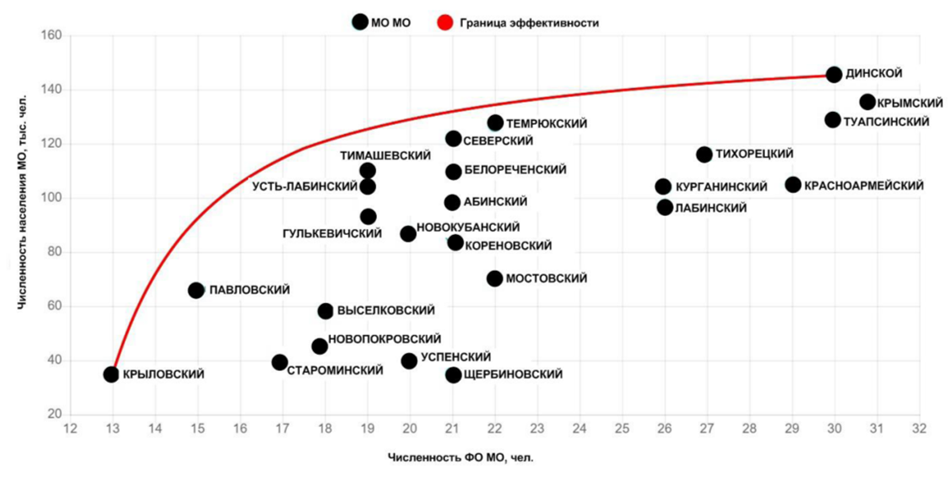 На рис. 2 отображены данные сравнительного DEA-анализа эффективности функционирования финансовых органов муниципальных образований (ФО МО – ось X) Краснодарского края в соотношении с численностью населения этих территорий (ось Y); точки на линии границы эффективности по горизонтали являются той целью, к которой объект (механизм управления ресурсами и результатами) должен стремиться для повышения эффективности системы.