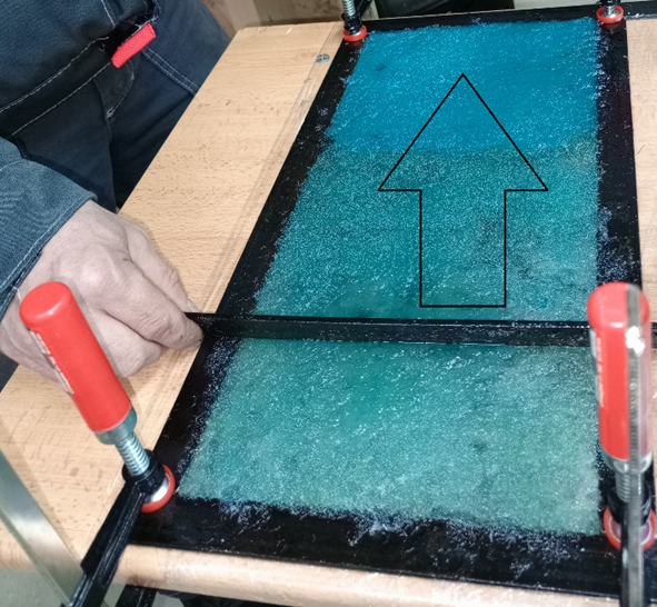 Для избегания склеивания готовых образцов с поверхностью стола в качестве разделителя сверху стол покрывается стрейч-пленкой, нейтральной к жирам, кислотам, щелочам, с температурой начала деформации не ниже 250 °C, т. к. не исключается процесс закипания полиэфирной смолы, сопровождающийся повышением температуры клея. Прежде чем покрыть столешницу стрейч-пленкой, ее промазывают кистью машинным маслом, которое обеспечивает адгезию поверхности столешницы и пленки, исключая образование пузырей, которые (исходя из первых опытов) приводят к образованию неравномерности наружного слоя образца, что влияет на различие толщины в разных точках.