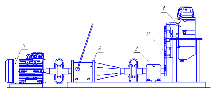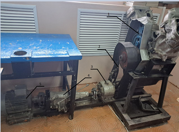 Все основные элементы стенда установлены жестко, с помощью болтового соединения на сварную раму. Несущие элементы рамы подкреплены закладными деталями, залитыми бетоном, для придания большей устойчивости и надежности стендовой установки. Основным звеном для испытания поршневых колец являются два цилиндра от V-образ-ного, шестицилиндрового двигателя ЯМЗ-236 (позиция 1). Данный двигатель широко применялся как в качестве главной энергетической установки, работающей на гребной винт, так и основного двигателя судовой электростанцией на маломерном флоте. Для стендовой установки от двигателя демонтировали два цилиндра с сохранением газораспределительного механизма и масляной системы. Основной объем масла для смазки всех трущихся элементов находится в съемном поддоне. Данная конструкция облегчает доступ к коленчатому валу, что особенно необходимо для периодического демонтажа и монтажа поршня. В качестве привода установленного двигателя служит электродвигатель мощностью 7,5 кВт, 3 000 об/мин (позиция 5). Из-за большой частоты вращения электродвигателя в конструкцию стенда дополнительно установили редуктор 3, цепную передачу 2 и коробку скоростей 4, предназначенные для понижения частоты вращения до оборотов работы среднеоборотных двигателей. Для возможности регулировки частоты вращения коленчатого вала, необходимой при испытаниях двигателя под разной нагрузкой, установлена коробка автомобильных передач. Данное устройство позволяет проводить испытания на четырех скоростях. Суммируя передаточные отношения каждого звена, стенд работает следующим образом: