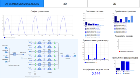 Для анализа различных сценариев работы морского пассажирского порта была создана цифровая транспортная модель с использованием программного обеспечения AnyLogic [16, 17]. В качестве исходных данных была выбрана интенсивность работы АО «Пассажирский порт Санкт-Петербург «Морской фасад» за навигационный период до 2019 г. Для каждого типа распределения входного потока было проведено большое количество экспериментов с использованием цифровой транспортной модели, разработанной в среде AnyLogic. Минимальное количество экспериментов при выделении отдельного состояния составляет 30 экспериментов. В цифровой модели реализована возможность не только менять законы распределения из набора базовых, но и формировать самостоятельные условия. Оконная форма разработанной цифровой модели морского пассажирского порта в вариантах 2D и 3D приведена на рис. 6.