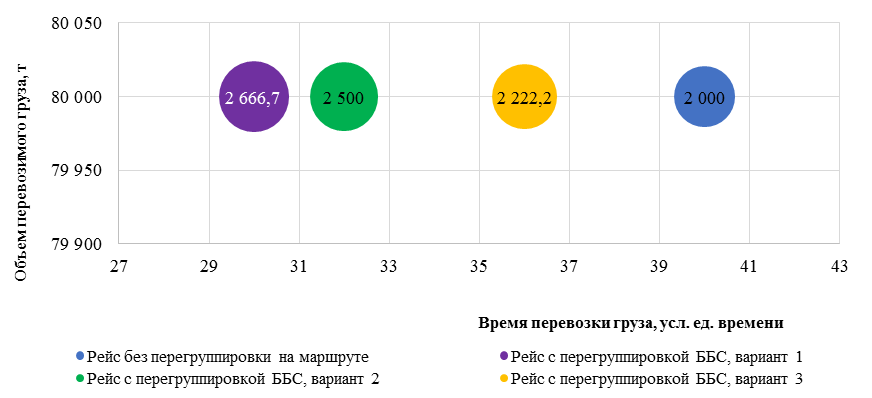 Вычисление значения целевой функции позволяет количественно сравнить эффективность организации перевозки по соотношению объема перевезенного груза и времени рейса / группы рейсов. На рис. 10 приведен пример вариантного сравнения эффективности возможной работы судов на маршруте при условии заданного объема перевозки. В кружках на рисунке обозначены значения целевой функции. В данном случае более эффективным является 1-й вариант рейса с перегруппировкой.