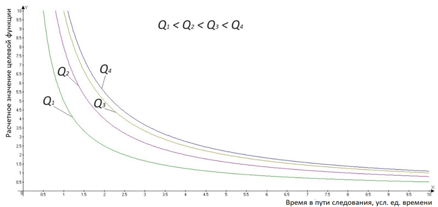 Построенные графики представляют собой семейство кривых. При этом расположение правее оси ординат определяет большее значение функции и более высокую эффективность реализации соответствующего способа организации перевозок по сравнению с сопоставляемыми. На рис. 9 наглядно представлена ситуация, при которой сравнительная эффективность двух вариантов изменяется по времени рейса, а точка пересечения характеризует момент, когда значение одной целевой функции превысило значение другой (сначала преимущество имеет второй вариант организации перевозок, после пересечения – первый вариант).