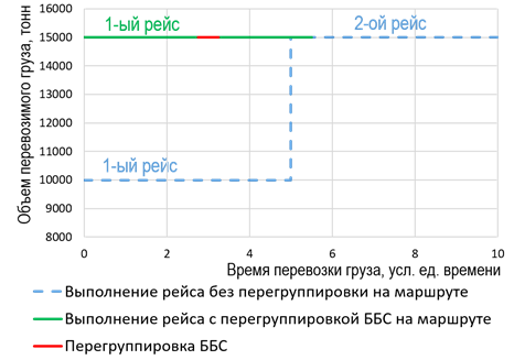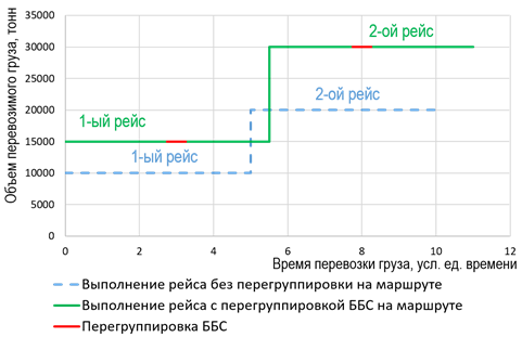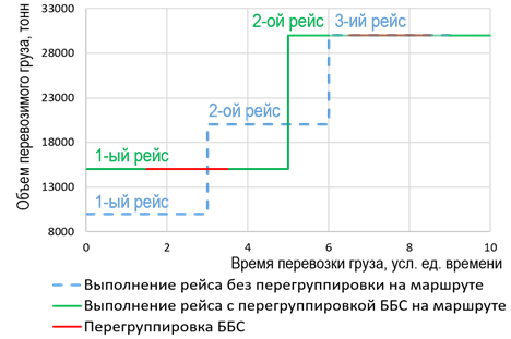Таким образом, метод определения эффективности организации перевозок грузов ББС, в том числе с перегруппировкой на маршруте следования, можно представить комплексом инструментов и действий, которые заключаются в расчете параметров движения в матричном виде, построении графиков целевой функции, вычислении ее расчетных значений и их сравнении между собой, анализе и подборе значений, наиболее удовлетворяющих критерию максимизации целевой функции.
