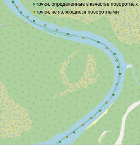 Далее поворотные точки были разделены на уровни в соответствии с ранее предложенной трехуровневой моделью. Так, участок, где осуществляется маневрирование, относится к 1 уровню, если при движении по нему состав изменяет свою скорость. Поворотные участки, для прохождения по которым требуется изменение расположения барж в составе, определяются ко 2 уровню. Если дополнительно необходимо изменение положения буксиров, назначается 3 уровень. Участки, не предполагающие изменения скорости и конфигурации состава, представляют собой метауровень. Пример дискретизации участка внутреннего водного пути приведен на рис. 2. Для дифференциации поворотных точек по описанным уровням использовались данные о скорости судов-аналогов по АИС и соотношения из [6, 7].