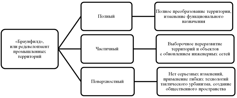 «Браунфилд» подразумевает перепланировку земельного участка с перспективным для инвестирования и строительства месторасположением. Имеющиеся улучшения на данном земельном участке не используются или находятся на стадии спада, требуют реконструкции или редевелопмента. Данные участки обеспечены строениями, сооружениями и инфраструктурой. К преимуществам инвестирования в проекты данного вида отнесем удачное месторасположение, наличие инфраструктуры, зданий и сооружений, которые можно модернизировать под новое целевое использование. Выделим три основных вида редевелопмента промышленных территорий (рис. 1).
