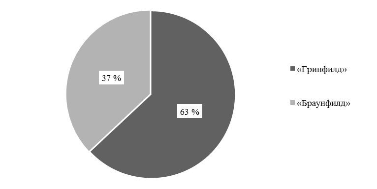 На рис. 2 представлено соотношение способов инвестирования по принципу «гринфилд» и «браунфилд», согласно данным Министерства промышленности и торговли РФ [12].