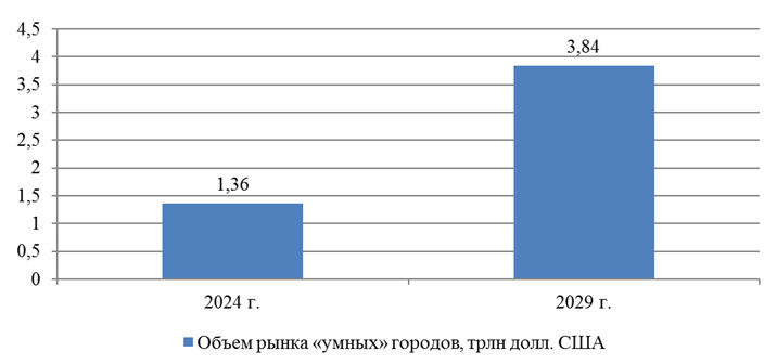 По данным Mordor Intelligence, рынок «умных» городов в стоимостном выражении будет развиваться высокими темпами и к 2029 г. его объем составит 3,84 трлн долл. США (рис. 3) [6].