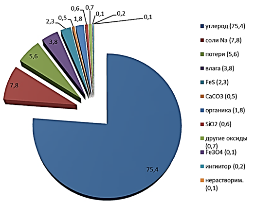 Следует учитывать предварительную подготовку отложения прокаливаем, т. к. в случае определения фосфатов, кремния, алюминия, металлов для растворения используют предварительно прокаленную пробу, а также потери при прокаливании пробы, взятой на растворение. Для этого вводят коэффициент пересчета, равный отношению массы пробы, взятой на прокаливание, к массе пробы после прокаливания. Тогда содержание компонента в исходной пробе отложения будет определяться как отношение содержание компонента, определенное аналитическим методам, к коэффициенту пересчета. Пример графического выражения компонентного состава отложения из печного змеевика приведен на рисунке [22].