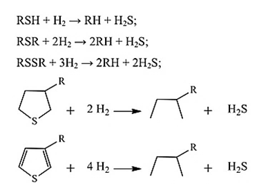 Сернистые соединения, входящие в компонентный состав нефтепродуктов, пагубно влияют на качество получаемых дистиллятов и продолжительность службы аппаратов, поэтому необходимость гидрообессеривания очевидна. К числу серосодержащих соединений относят меркаптаны, сульфиды и дисульфиды, тиофаны и тиофены. В настоящее время химизм процесса гидрообессеривания изучен. В условиях гидрокрекинга первоочередно подвергаются обессериванию меркаптаны и сульфиды, затем тиофены и бензотиофены. Химическое превращение представляют в следующем виде (рис. 1).