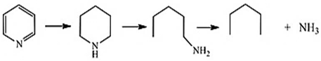 Удаление азотсодержащих соединений затруднительно, но является необходимой мерой в переработке. Эти гетероатомные соединения не влияют на эксплуатационные характеристики продуктов, но отрицательно воздействуют на катализаторы гидрокрекинга, снижая активность и, соответственно, срок службы, а также вызывают потемнение и смолообразование. К азотсодержащим соединениям нефти относят амины, пиридины, хинолины и пиперидины. Удаление азота из шестичленных циклов включает в себя стадию гидрирования ароматического кольца и дальнейшего выведения азота в виде аммиака (рис. 2).