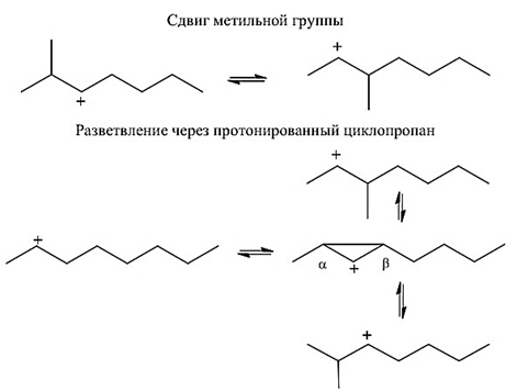 Гидрокрекинг совместно с изомеризацией являются также неотъемлемой частью процесса. Химизм рассмотрен на примере гидрокрекинга и изомеризации октана (рис. 3) [4].