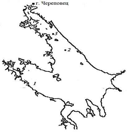 1 – 58° 23' с. ш., 37° 45' в. д.; 2 – 58° 43' с. ш., 38° 16' в. д.; 3 – 58° 51' с. ш., 38° 06' в. д.