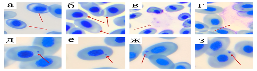 Fig. 2. Pathology of erythrocytes of juvenile sterlet in an experiment using functional feed additives