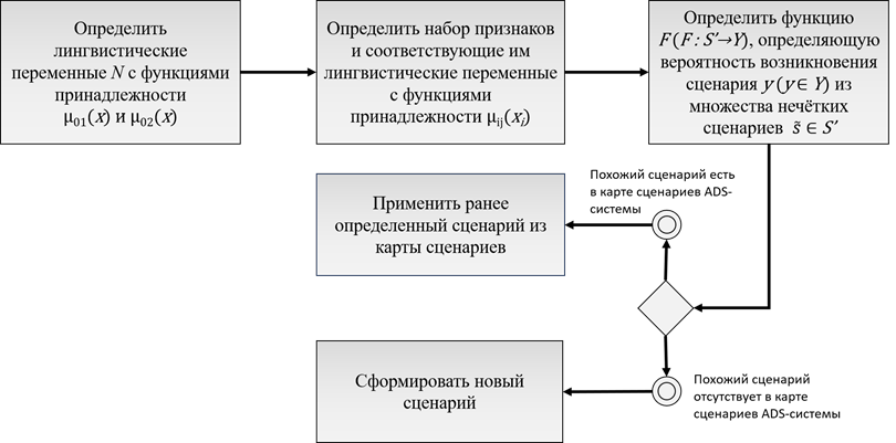 В качестве развития исследований в предложенном направлении для обработки лингвистических переменных и автоматического определения набора их признаков сценариев (первые два функциональных блока на рис.) можно использовать наработки [13] и [15]. Для поиска максимального значения принадлежности состояния ADS-системы x (x ∈ X)