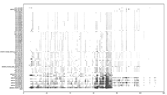 3. Для изучения активности студентов используется построение диаграммы рассеяния (scatter plot). Диаграмма имеет два измерения: по оси x отмечены временные характеристики событий, по оси y – идентификаторы событий. Строки соответствуют конкретному событию в системе. Каждая точка скаттера представляет собой структуру, хранящую данные идентификатора пользователя и его активности.