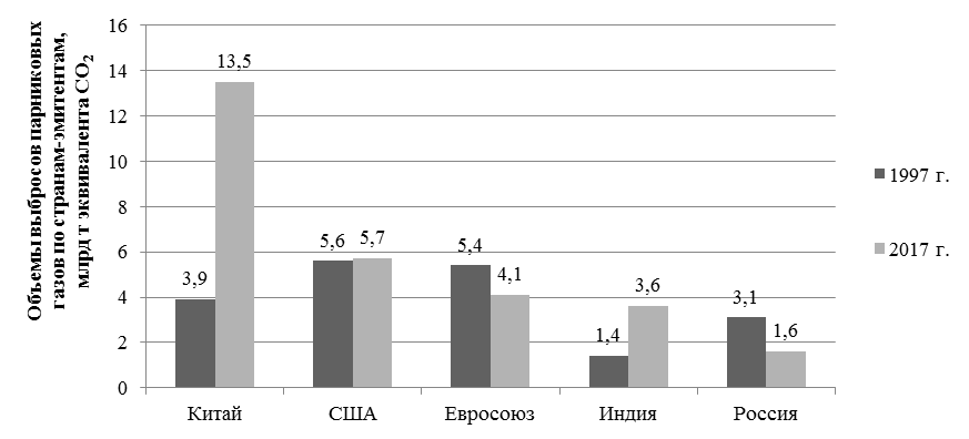 Рис. 1. Объемы выбросов парниковых газов по странам-эмитентам