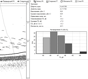 Frame-by-frame file processing was performed at a frequency of 200 KHz. The result of it was the obtaining of quantitative values of vendace densities (in terms of unit area (hectare)) with their spatial reference. This and a number of other information were recorded in text files for further analysis of this information by spreadsheets software.