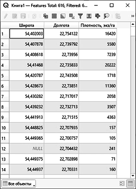 Fig. 3. A layer of point objects with information about the coordinates and density of fish aggregations (a) |