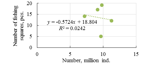 As it can be seen from the obtained results in both cases there is no statistically significant linear relationship between the vendace population and water body areas in which high concentrations of vendace are formed (despite the fact that in accordance with the Chaddock scale this relationship for the entire series of years can be considered as average). The absence of dependence is also confirmed by a comparative analysis of the results of the spatial distribution of vendace in accordance with hydroacoustic survey data, for example, 2020 and 2021. Thus, in 2020 the smallest population of vendace was observed (7,22 million specimens), however, the number of fishing squares in which high density aggregations is registered was almost 3 times greater compared to 2021. All this indicates that some other factors influence on formation of high vendace concentrations in water column and the number of water body areas (fishing squares) with high density of aggregations (over 10,000 specimens/ha) does not depend on the vendace population.