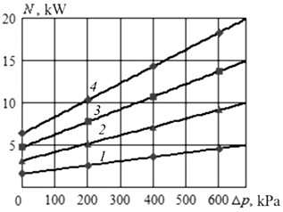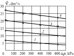 where a0, a1, a2, b1, b2 are empirical constants, the values of which are determined from experimental data; Δp is the pressure drop, Pa; n is the rotor speed (RS), s–1. For example: a0 = 0.0020225 m3; a1 = 3.50 · 10–7 m3/kPa; a2 = 1.88 · 10–6 s–1/kPa; b1 = 0.4755 kJ; b2 = 0.001492 kJ/kPa (Atlas W63-1B pump).