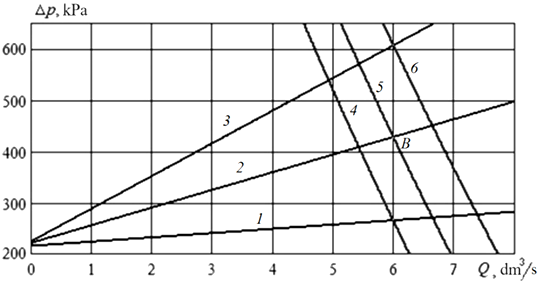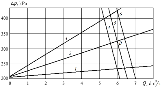 It is possible to determine the RS at which the required SSP supply will be. Let d = 35 mm (line 2 in Fig. 3). OP should be at the intersection point of line 2 with the vertical Q0 = 6 dm3/s (point B in Fig. 3). According to Q0, formula (13) allows us to calculate the pressure drop in OP: ΔpOР = 428.3 kPa. If the obtained value of ΔpOР, Q0 and formula (8) are substituted into (5), we obtain a nonlinear equation with one unknown – n. Solving it numerically leads to the desired value RS n = 4.68 s–1. The parameters in the other two OP were calculated in a similar way in Fig. 3. The calculation results are presented in Table 2 (η – efficiency;
