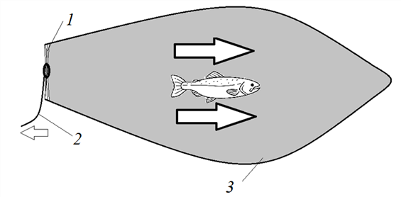 As a result, the flow of water entering the mouth reveals the proposed device, made in the form of a funnel. Horizontal opening can be provided by a beam made of bamboo or carbon fiber poles. The open mouth captures the fish, which moves, bypassing the open net funnel-shaped device into the net part of the trawl bag. After the end of the trawling, the net part of the funnel-shaped device is tightened with a flexible cable passed through the rings, which prevents the fish from leaving the mouth of the trawl bag (Fig. 2).