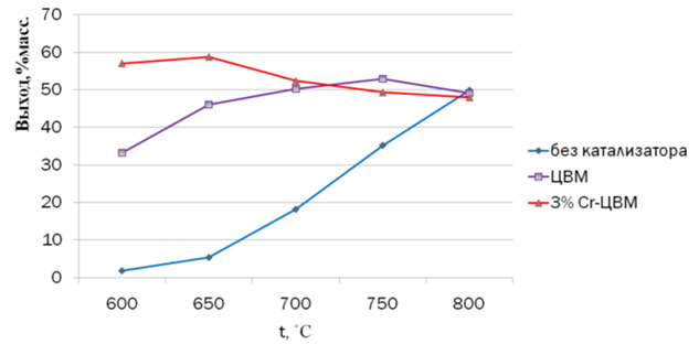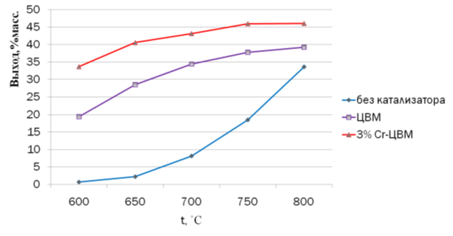Приведено сравнение полученных результатов каталитического пиролиза на катализаторе типа ЦВМ, модифицированного введением хрома в количестве 3 % масс. с термическим процессом при тех же технологических параметрах. Необходимо отметить, что с повышением температуры процесса каталитического пиролиза бутановой фракции от 600 до 800 °С в присутствии всех изученных образцов катализаторов наблюдалось увеличение выхода этилена.