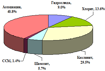 Глинистый цемент коллекторов представлен сложным полиминеральным составом (рис. 1, б): каолинитом (К) ~ 30 %, гидрослюдой (Гс) ~ 9 %, хлоритом (Хл) ~ 14 %, шамозитом (Ш) ~ 6 %, смешаннослойным материалом (ССМ) – 1,4 % и ассоциациями (среднее содержание ~ 41 %) из гидрослюды и смешаннослойного материала, также хлорита и шамозита.