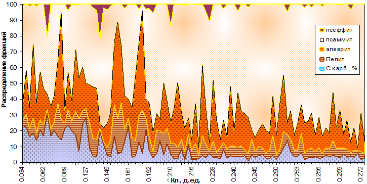 Fig. 4. The results of granulometric analysis, ordered by porosity, for the Neocomian deposits of deposit “K”