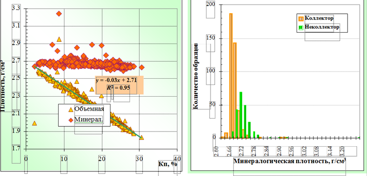 Минералогическая плотность матрицы увеличивается со снижением пористости, что в основном связано с увеличением содержания карбонатного материала. В неколлекторах средняя величина δмин составляет 2,69 г/см3, в коллекторах – 2,65 г/см3 (см. рис. 5, б).